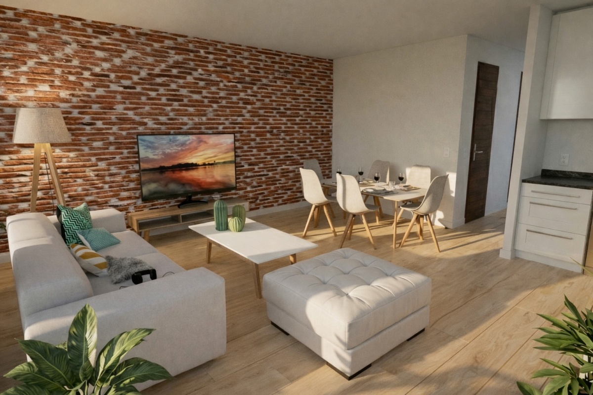 Comedor/sala integrados con estufa de alto rendimiento para disfrutar más el invierno.